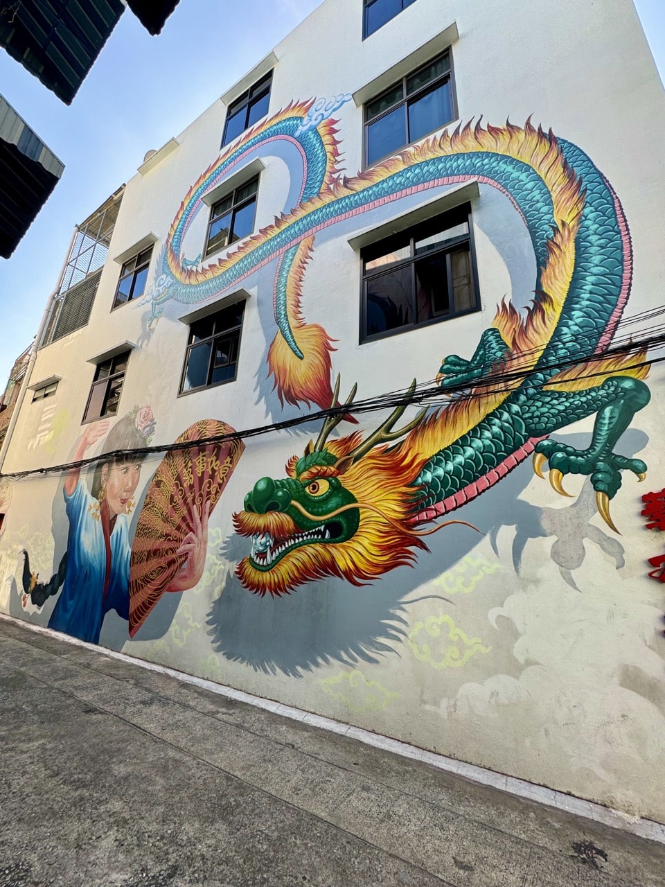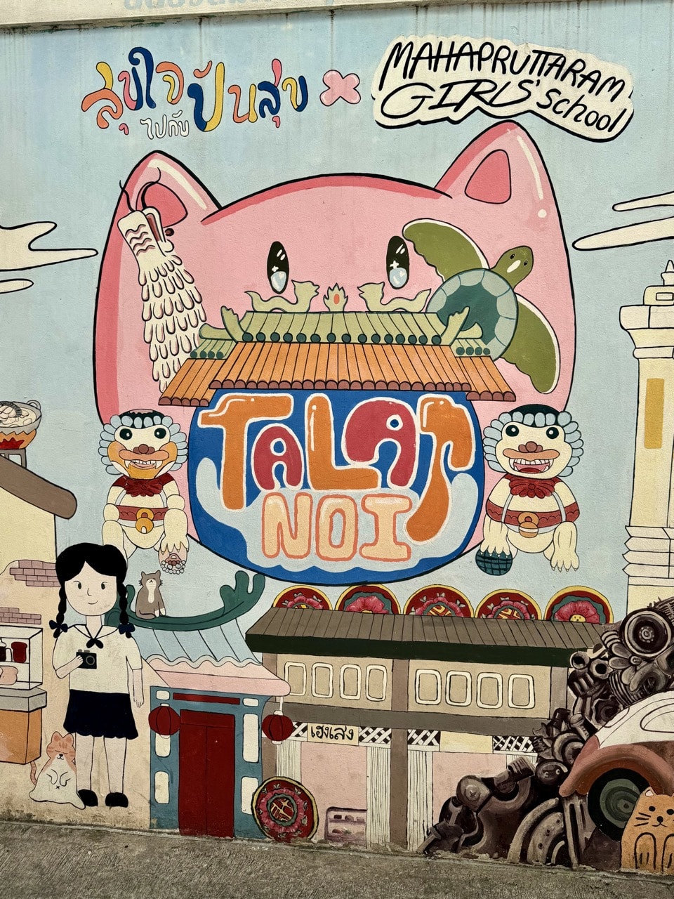 Disfrutaremos con los murales de arte callejero en la calle conocida cómo Talat Noi Art Street, variadas piezas de arte decorando las paredes y abarcando una amplia gama de estilos y temas. Podremos encontrar obras que van desde retratos realistas hasta diseños abstractos y temáticas culturales y sociales. Muchos de los murales reflejan la historia y la cultura local, así como también temas contemporáneos y globales.