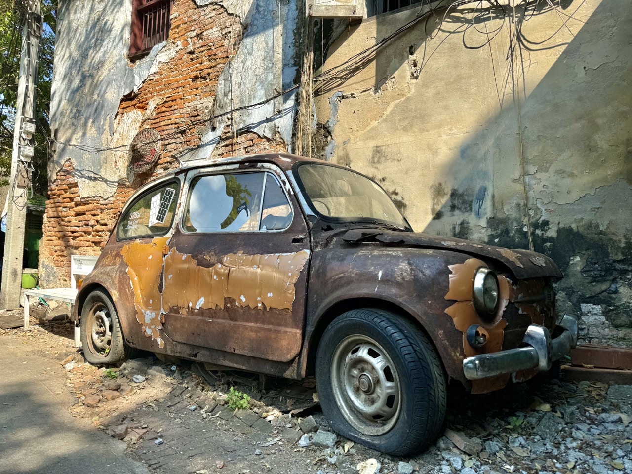 A continuación contemplaremos la insignia de Talat Noi, el “Antique Turtle Car” (Coche Tortuga Antiguo). Este peculiar vehículo conocido como “Turbo Jeng” fue abandonado aquí, nunca volvió a ser reclamado y se convirtió en imagen principal de Talat Noi de color abstracto oxidado hasta el punto de desintegrarse.
