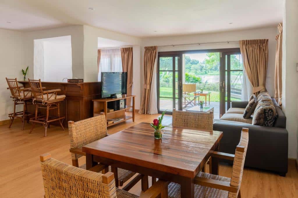 Ubicados a orillas del pintoresco río Mae Kok, los amplios estudios y villas están equipados con lujosos muebles y un baño tropical. Sin embargo, el lujo no termina con el mobiliario de las habitaciones, sino que continúa con las impresionantes instalaciones. Entre otros, se encuentran la piscina de borde infinito con vista al río, el spa al aire libre que lo acerca a la naturaleza mientras le asegura un confort absoluto y el restaurante Sala Rim Nam Thai con una exquisita selección de cocina tailandesa y occidental, preparada en la cocina al aire libre y presentada creativamente en el fondo. de las impresionantes vistas del río y las montañas.